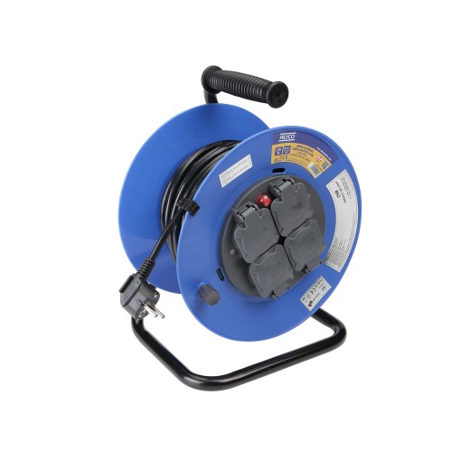El enrollacables cuenta con cuatro tomas Schuko con toma de tierra y tapas protectoras contra polvo y humedad. Incluye botón rojo de seguridad térmica que corta la corriente en caso de sobrecarga o sobrecalentamiento, proporcionando máxima protección al usuario y a los equipos conectados. Cumple con las normas CE y GS de seguridad eléctrica, siendo apto para entornos industriales y aplicaciones profesionales de alta demanda.