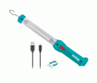 Lámpara LED de trabajo recargable. Conector USB de carga eléctrica. Peso 220 gr. Flujo luminoso máximo de 300 lúmenes. Con gancho para colgar. Incluye cable USB.