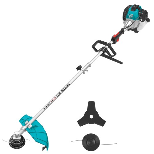 La desbrozadora de TOTAL es un equipo extremadamente potente, con el que incluso se puede controlar fácilmente la vegetación persistente en áreas de difícil acceso del jardín. Un motor de dos tiempos de alta calidad proporciona mucha potencia, que gracias al cigüeñal de doble cojinete y a la función antivibración funciona de manera particularmente silenciosa y con baja vibración. Todos los controles de la herramienta son fácilmente accesibles desde el manillar central. Para un corte profesional la desbrozadora puede equiparse con una cuchilla de 3 dientes o con una bobina de doble hilo que se incluyen en la entrega. Su sistema de arranque con el cebador de fácil acceso y el estárter automático permite un arranque rápido y conveniente. La seguridad en el trabajo está garantizada por el embrague centrífugo, que desacopla la herramienta de corte en régimen de ralentí. La cómoda correa de transporte garantiza un trabajo sin esfuerzos. Para facilitar el transporte y ahorrar espacio en su almacenamiento, el recortabordes se puede desmontar en dos partes gracias al eje dividido.