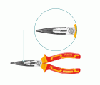 Alicate aislado de punta plana. Fabricado en Cr-V. Mango bimaterial con certificado VDE que soporta hasta 1000 V en corriente alterna y 1500 V en corriente continua.