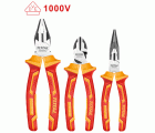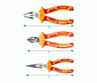 Juego de 3 alicates aislados. Alicate aislado universal de 180 mm. Alicate aislado de corte diagonal de 160 mm. Alicate aislado de punta plana de 160 mm. Fabricados en Cr-V. Mango bimaterial con certificado VDE que aísla hasta 1000 V en corriente alterna y 1500 V en corriente continua.