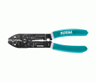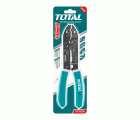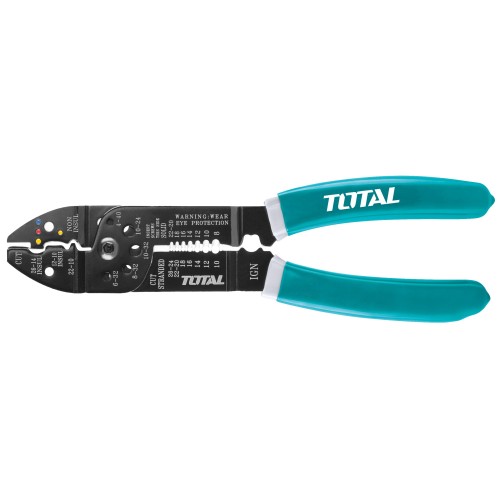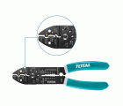 El pelacables de TOTAL Mod. THT15851. Esta herramienta de 215 mm ofrece funciones de corte, pelado y engarce. Es capaz de trabajar con 7 medidas diferentes de cables, proporcionando una solución versátil y eficiente para diversas tareas de cableado.