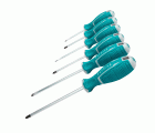 Juego de 6 destornilladores. 3 punta plana: SL5,5 x 5 x 75 - SL5,5 x 5 x 100 - SL6,5 x 6 x 150 mm. 3 punta Phillips: PH1 x 5 x 75 - PH1 x 5 x 100 - PH2 x 6 x 150 mm. Fabricado en Cr-V. Varilla redonda. Mango bimaterial. Punta imantada.