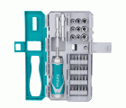 Juego de 33 piezas. Mango con función carraca. 5 puntas planas: SL3 - SL4 - SL5 - SL6 - SL6. 5 puntas Phillips: PH0 - PH1 - PH2 - PH2 - PH3. 2 puntas Pozidrive: PZ1 - PZ2. 5 puntas Torx: T10 - T15 - T20 - T25 - T30. 3 puntas Hexagonales: HEX3 - HEX4 - HEX5. 1 adaptador 25 mm. 9 casquillos de 1/4'' x 20,5 mm: 4 - 5 - 6 - 7 - 8 - 9 - 10 - 11 - 12 mm. 1 soporte para puntas de 4 x 60 mm. 1 portapuntas de 6,35 x 50 mm. Fabricado en Cr-V.