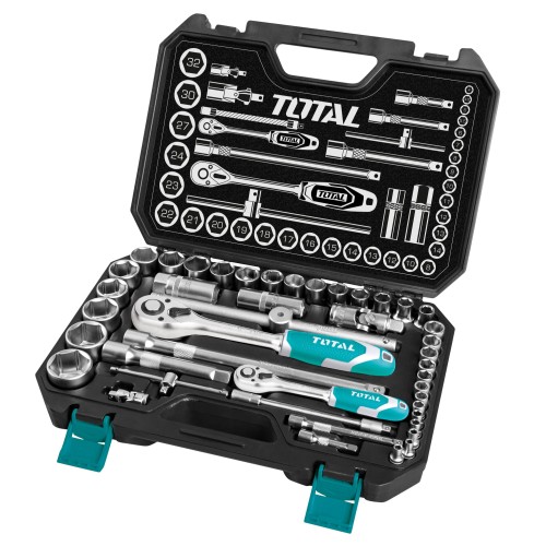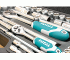 Maletín de vasos de 1/4'' y 1/2''. 1 llave de carraca de 1/4'' de 45 dientes. 13 vasos de 1/4'': 4-4,5-5-5,5-6-7-8-9-10-11-12-13-14 mm. 1 conector articulado de 1/4''. 2 barras de extensión de 1/4'': 50 y 100 mm. 1 barra en T deslizante de 1/4'' de 114 mm. 1 barra de extensión flexible de 1/4'' de 150 mm. 1 llave de carraca de 1/2'' de 45 dientes. 18 vasos de 1/2'': 8-10-12-13-14-15-16-17-18-19-20-21-22-23-24-27-30-32 mm. 1 conector articulado de 1/2''. 2 barras de extensión de 1/2'' de 125 y 250 mm. 1 barra en T deslizante de 1/2'' de 250 mm. 2 vasos de bujía de 1/2'' de 16 y 21 mm. Fabricado en Cr-V.