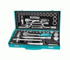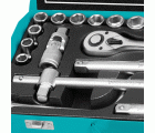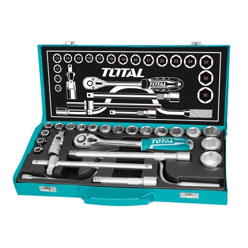Maletín de vasos de 1/2''. Medidas de 10 - 11 - 12 - 13 - 14 - 15 - 16 - 17 - 18 - 19 - 20 - 21 - 22 - 23 - 24 - 27 - 30 - 32 mm. 1 Adaptador, 1unión universal. 2 barras de extensión 125 mm y 250 mm. Fabricado en Cr-V.