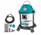 El aspirador en seco y húmedo de TOTAL es un aspirador flexible y potente para una sencilla limpieza en seco o húmedo. El depósito de acero inoxidable de 12 litros, que se puede limpiar fácilmente, absorbe sin residuos la suciedad gruesa, fina, húmeda o seca hasta los líquidos. Gracias al fuerte motor de 1.000 W no sólo se consigue una buena potencia de aspiración, además, con la práctica función de soplado, en todo momento está a disposición suficiente presión para el soplado adicional de puntos difícilmente accesibles. En la aspiración en húmedo un filtro de espuma adicional protege el motor frente a impurezas. El aspirador está equipado de un sistema de tubo flexible de 32 mm con pequeña conexión, compuesto de un tubo flexible de aspiración, 3 tubos de prolongación y una pieza adaptadora. La gran boquilla de aspiración enviada con inserto combinado se debe usar igualmente para suelos lisos y con alfombra, además, con la boquilla de juntas también se pueden limpiar cuidadosamente las esquinas y ángulos estrechos. El asa de transporte estable y las cuatro ruedas de conducción de marcha suave proporciona la mayor movilidad posible.