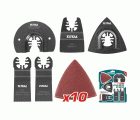 Juego de 15 accesorios para la multiherramienta. Accesorio sierra circular diámetro de 87 mm. Accesorio delta para lija. 10 accesorios de lija delta para madera de 80 mm. Accesorio de corte de madera 34 mm. Accesorio de corte bimetal medida 34 mm. Accesorio de rascado de 50 mm. Para multiherramientas TOTAL TS3066 (40072) y TMLI2001 (40039).