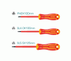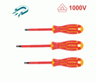 Juego de 3 destornilladores aislados. SL4 - SL5 - PH2. Mango bimaterial con certificado VDE que soporta hasta 1000 V en corriente alterna y 1500 V en corriente continua.