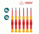 Juego de 6 destornilladores de precisión aislados. Medidas de 1,5 x 0,23 - 0,4 x 0,40 - 2,5 x 0,5 - 3 x 0,5 de 50 mm. Punta Phillips PH00 - PH0 de 50 mm. Certificado VDE que permite trabajos hasta 1000 V.