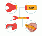 El Juego de 7 llaves fijas aisladas de TOTAL Mod. THKISPA0701 es una herramienta esencial para trabajos eléctricos, ofreciendo seguridad y precisión. Este juego incluye llaves fijas en las siguientes medidas: 8 mm, 10 mm, 12 mm, 13 mm, 14 mm, 17 mm y 19 mm, proporcionando una amplia gama de opciones para diversas aplicaciones. Cada llave está aislada y cuenta con un certificado VDE, lo que permite su uso en trabajos eléctricos hasta 1000 V, garantizando la seguridad del usuario en entornos de alta tensión. Este certificado asegura que las llaves cumplen con los estándares internacionales de seguridad y calidad.