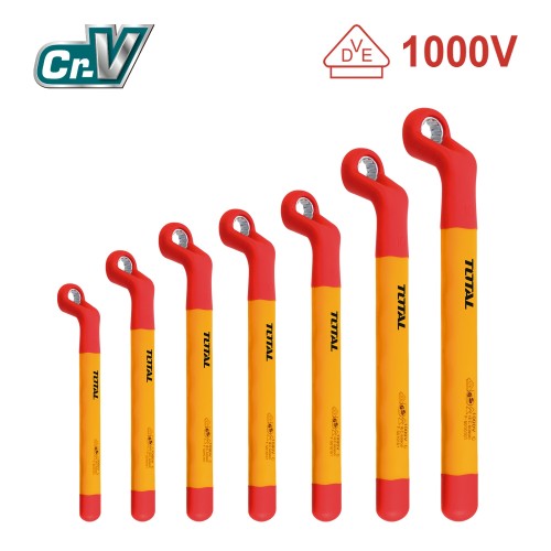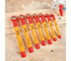 Juego de 7 llaves acodadas aisladas. Medidas de 8-10-12-13-14-17- 19 mm. Certificado VDE que permite trabajos hasta 1000 V.