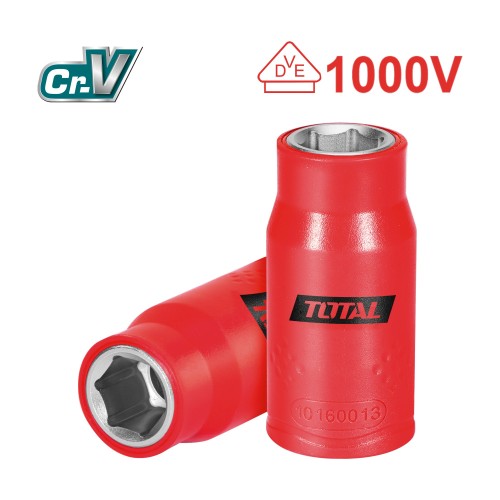 El vaso aislado cuadrado TOTAL Mod. THIHAST12 es una herramienta hexagonal de inserción de 1/2'', fabricada en cromo-vanadio (Cr-V). Cumple con la norma EN60900 y está certificado por VDE para realizar trabajos eléctricos seguros hasta 1000 V. Con una medida de 16 mm, este vaso es perfecto para ajustar y desmontar componentes en sistemas eléctricos bajo tensión, garantizando precisión y seguridad en aplicaciones eléctricas profesionales.