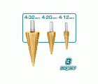 Juego 3 brocas escalonadas. Eje 6 mm ancho de 4 - 12 mm y escalón de 1 mm. Eje 8 mm ancho de 4 - 20 mm y escalón de 2 mm. Eje de 10 mm ancho de 4 - 32 mm y escalón de 2 mm. Adecuadas para gruesos de acero inferiores a 3 mm.