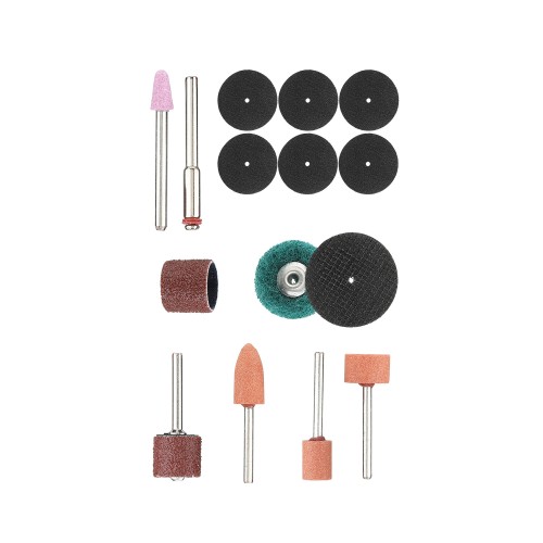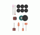 Conjunto de 25 accesorios para miniamoladora. 1 rueda de corte. 1 abrasivo en bufanda. 4 piedras de moler. 7 bandas de lijado. 10 discos de lija. 1 mandril. 1 tambor de lijado con mandril.