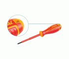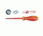- Destornillador aislado Punta Phillips. Varilla redonda. Mango bimaterial con certificado VDE que soporta hasta 1000 V en corriente alterna y 1500 V en corriente continua.