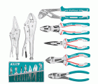 Bolsa combo de 7 alicates, tenazas y mordazas. 1 tenaza ajustable de canal de 250 mm. 1 alicate universal reforzado 200 mm. 1 alicate punta plana reforzado de 200 mm. 1 alicate corte diagonal reforzado de 200 mm. 1 mordaza grip de 250 mm. 1 mordaza de punta plana de 225 mm. 1 alicate de sujeción.