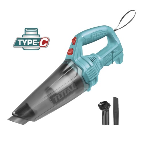 El aspirador portátil a batería de TOTAL es la herramienta perfecta para recoger el polvo y retirar suciedad y migas molestas. El aspirador de mano limpia rápidamente cualquier superficie gracias a sus dos boquillas incluidas. La boquilla de tapicería es adecuada para tapicería, asientos de coche y telas. Con la boquilla de juntas de también pueden limpiarse puntos difícilmente accesibles sin gran esfuerzo. El recipiente colector de polvo dispone de una capacidad de 500 ml y puede vaciarse fácilmente. El ligero aspirador queda agradable y fácilmente en la mano por la forma constructiva ergonómica y superficies de agarre suave. El filtro de suciedad integrado se puede limpiar con agua corriente y reutilizarse tras secarse completamente. La carga de la batería interna de este aspirador se efectúa mediante conexión USB-tipo C. De esta manera podemos utilizar los múltiples puertos de carga de los diversos aparatos que utilizan este tipo de conexiones de carga.