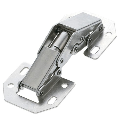 Bisagra de cangrejo en acero. Con pistón para amortiguar el cierre. No necesita hacer cajeado.