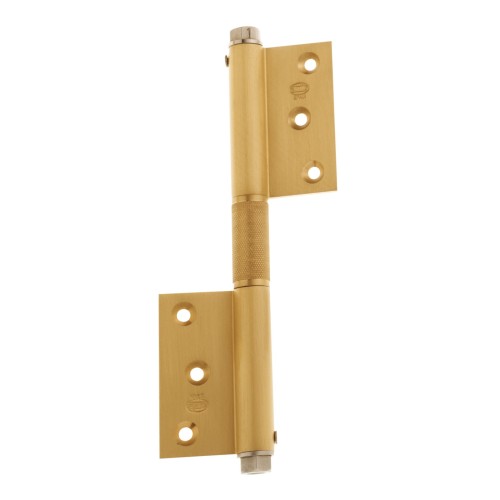 Bisagra muelle con canto cuadrado fabricado de un perfil de latón de alta calidad. Muelle compuesto por flejes canteados fabricados en acero inoxidable AISI 301 calidad K01. Incluye llave Allen. Gran resistencia a la torsión. Para puertas ligeras, máximo: 40 kg.