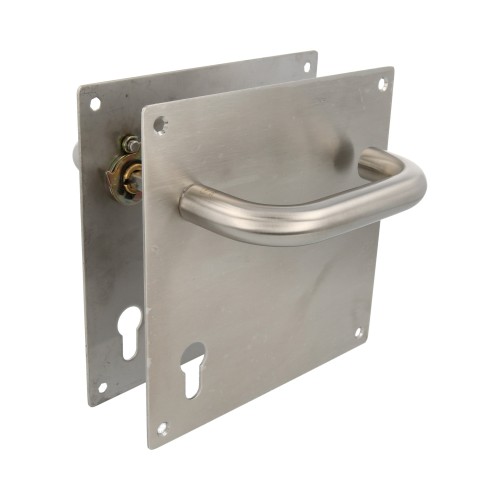 - JUEGO DE MANILLAS CON PLACA: Juego de manillas de Acero Inoxidable con placa cuadrada, para puertas de interior o exterior. De diseño sencillo y moderno, con cómoda manivela que se adapta a la mano y no resbala. Se recomienda limpiar con un paño húmedo.