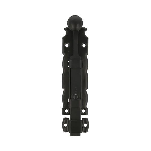 Pasador de sobreponer en acero con eje de zamak para puertas de paso. Muy decorativo y de color negro, de cuidado diseño estilo forja perfecto para puertas y portones de estilo rústico.