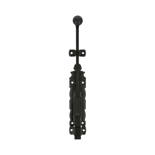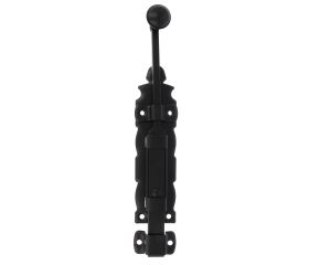 Pasador de sobreponer en acero con eje de zamak para ventanas. Muy decorativo, de cuidado diseño estilo forja perfecto para ventanas de estilo rústico. En negro, un color neutro que quedará perfecto con cualquier tipo de material o color de la puerta.