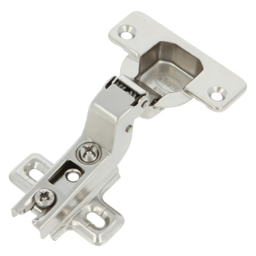 Bisagra de cazoleta super acodada en acero fija. Distancia entre agujeros: 48 mm. Apertura: 110°.