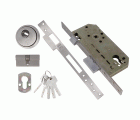 - Cerradura de embutir para puertas de madera con paletón de cierre y canto cuadrado. Frente, soporte y picaporte reversible de acero inoxidable. Incluye cilindro de seguridad modelo 9850 de 60 (30-30) mm y escudo de seguridad modelo 31 sin bocallave.
