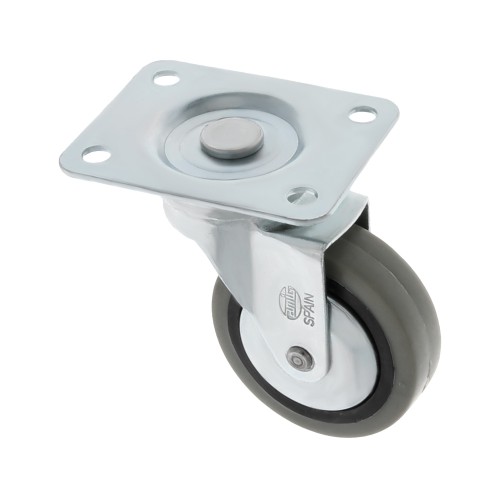 Rueda de goma. Con pletina. Sistema de fijación con tornillos. Buena resistencia a la abrasión y silenciosa. Uso semi-industrial y mobiliario.