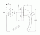 Manilla para ventanas con sistema europeo de cremonas. Con cuadradillo de 7 mm y tetones de 10 mm. Con llaves iguales. Tornillo para manillas M5 x 40 mm Cód: 3402.