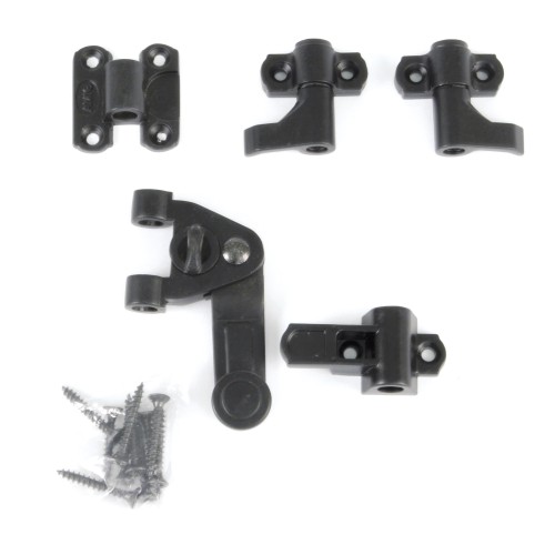 Conjunto de herrajes para el cierre de una contraventana de una hoja. 1 manilla reducida, 1 bloqueo de manilla. 1 gancho derecho, 1 gancho izquierdo y 10 tirafondos.