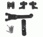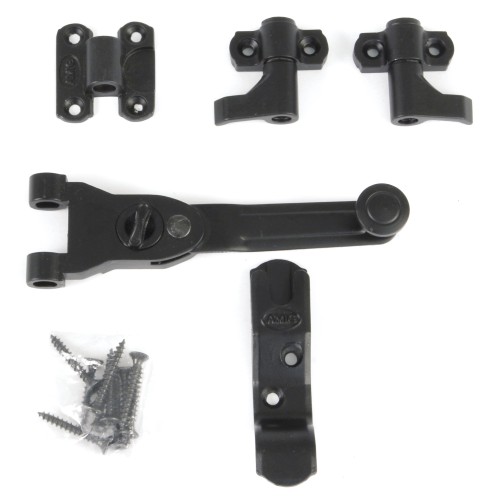 Conjunto de herrajes para el cierre de una contraventana de dos hojas. 1 manilla reducida, 1 bloqueo de manilla. 1 gancho derecho, 1 gancho izquierdo y 10 tirafondos.