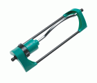 Aspersor oscilante con base estable. Fabricado en material ABS en color verde y aluminio galvanizado. Con adaptador universal para mangueras, ideal para regar césped y plantas del jardín.