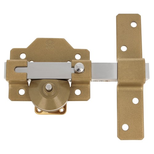 Cerrojo de sobreponer con cilindro redondo de seguridad y pulsador de apertura. Alta resistencia a la extracción, arranque y rotura. Apertura mediante llave desde el exterior de la puerta y mediante pulsador desde el interior. Longitud del cilindro: 50 mm. Incluye 5 llaves de puntos.