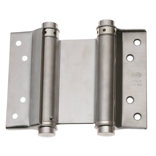 Bisagra de doble acción con canto cuadrado fabricada en acero inoxidable de alta calidad. Regulación de la potencia de cierre. Gran resistencia a la torsión. Muelle de acero elástico flexible. Accesorios incluidos.
