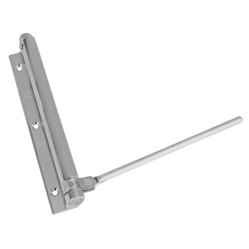 Pernio muelle con brazo en acero inoxidable. Muelle de acero elástico flexible para cierre automático de puertas. Regulación de potencia de cierre, incluye llave Allen. Tirafondos de acero inoxidable 18/8 y soporte de nylon negro. Para puertas ligeras, máximo: 40 kg.