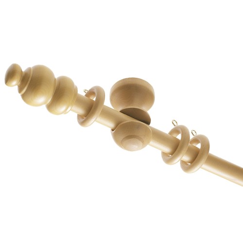 Conjunto de madera para techo. 1 barra de 1,6 m. 2 soportes de frente. 15 anillas. 2 terminales. Incluye accesorios de fijación.