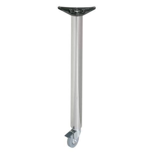 Pata para mesas de acero acabado en cromado mate con ruedas giratorias, bloqueables con freno. De fácil colocación sobre cualquier superficie plana. Incluye tornillos para la fijación de la placa al tablero.