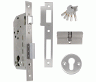 Cerradura de embutir para puertas de madera con paletón de cierre. Picaporte reversible de acero cromado. Distancia entre nueca de manilla y alojamiento de cilindro Europerfil: 85 mm. Entrada: 50 mm. Nueca para manilla de 8 mm. Caja cerrada y mecanismo interior de acero bicromatado. Palanca de cierre de acero cromado, desplazamiento 20 mm (2 vueltas). Incluye cilindro de seguridad modelo 9850 de 60 (30-30) mm y bocallave modelo 22. Homologada con marcado CE según norma EN 12209:2004.