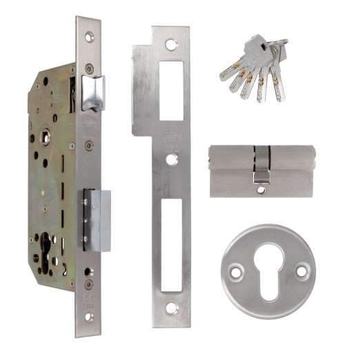 Cerradura de embutir para puertas de madera con paletón de cierre y canto cuadrado. Frente, soporte y picaporte reversible de acero inoxidable. Incluye cilindro de seguridad modelo 9850 de 60 (30-30) mm y bocallave modelo 22.