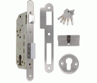 Cerradura de embutir para puertas de madera con paletón de cierre. Picaporte reversible de acero cromado. Distancia entre nueca de manilla y alojamiento de cilindro Europerfil: 85 mm. Entrada: 50 mm. Nueca para manilla de 8 mm. Caja cerrada y mecanismo interior de acero bicromatado. Palanca de cierre de acero cromado, desplazamiento 20 mm (2 vueltas). Incluye cilindro de seguridad modelo 9850 de 60 (30-30) mm y bocallave modelo 22. Homologada con marcado CE según norma EN 12209:2004.