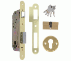 Cerradura de embutir para puertas de madera con paletón de cierre. Picaporte reversible de acero cromado. Distancia entre nueca de manilla y alojamiento de cilindro Europerfil: 85 mm. Entrada: 50 mm. Nueca para manilla de 8 mm. Caja cerrada y mecanismo interior de acero bicromatado. Palanca de cierre de acero cromado, desplazamiento 20 mm (2 vueltas). Incluye cilindro de seguridad mod 9850 de 60 (30-30) mm y bocallave mod 22. Homologada con marcado CE según norma EN 12209:2004.