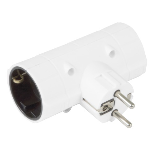 Adaptador Schuko de 2 vías con toma de tierra. Pines de Ø 4,8 mm. Amperaje máximo: 10/16 A. Voltaje máximo: 250 V. Potencia máxima: 3500 W.