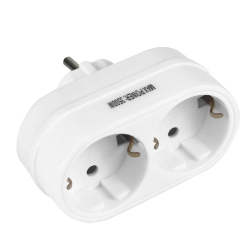 Adaptador Schuko de 2 vías con toma de tierra. Pines de Ø 4,8 mm. Amperaje máximo: 10/16 A. Voltaje máximo: 250 V. Potencia máxima: 2200 W.