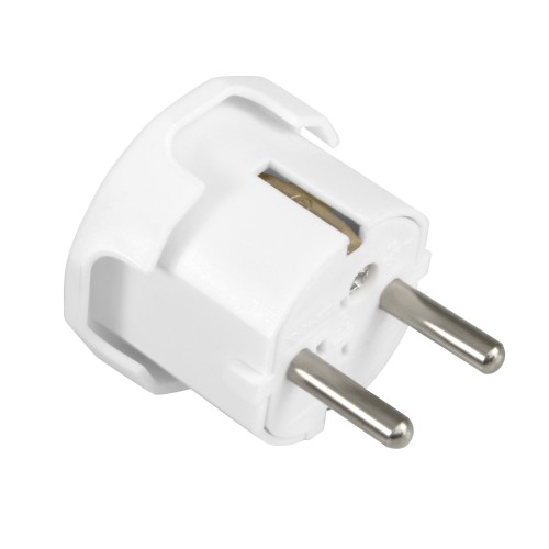 Clavija Schuko con toma de tierra. Salida lateral con pines de Ø 4,8 mm. Amperaje máximo: 10/16 A. Voltaje máximo: 250 V.
