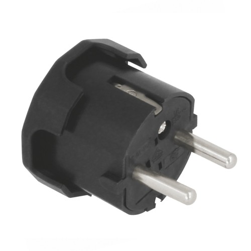 Clavija Schuko con toma de tierra. Salida lateral con pines de Ø 4,8 mm. Amperaje máximo: 10/16 A. Voltaje máximo: 250 V.