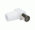 Conector hembra acodado para cable coaxial de TV. Con receptáculo donde se inserta el conector macho. Clavija en ángulo de 90° para evitar dobleces. Compatible con estándares de conexión de TV comunes.