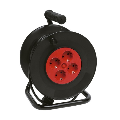 - Enrollacables portátil con bastidor para bricolaje con 4 bases Schuko con toma de tierra. Cable alargador de 50 metros 3G 1,5 mm². Con asa para poder transportarlo o colgarlo cómodamente y buena estabilidad.