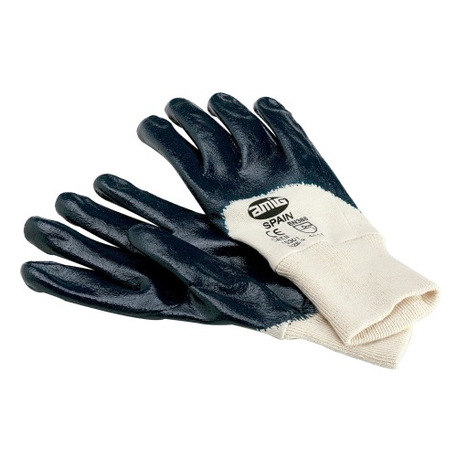 Guante mixto de nitrilo sobre algodón. Con puño elástico. Para riesgos mecánicos. Norma: EN420 - EN388. Para manipulación de piezas aceitadas, materiales de construcción e industria de la madera.
